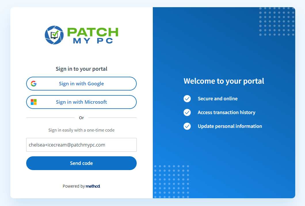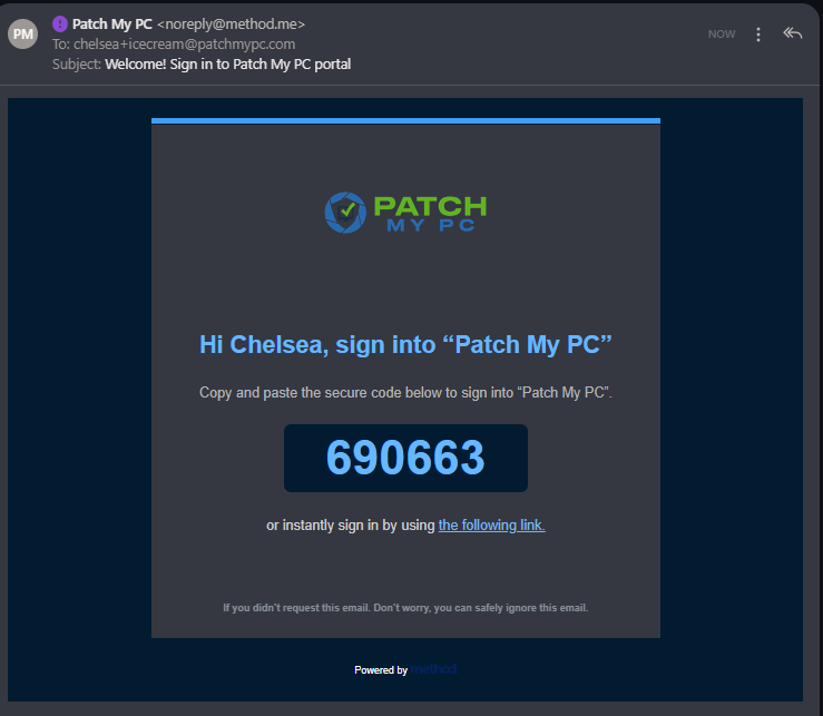 If the code takes longer than 5 minutes to arrive, please double check your spam as the email comes from "<noreply@method.me>". If you still do not receive it, please email us at **<sales@patchmypc.com>**.&#x20;